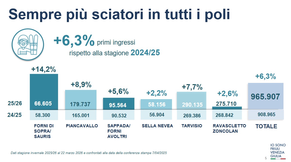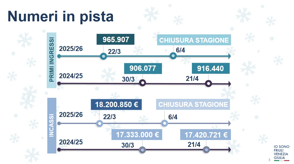Qui sotto è possibile vedere un paragone  tra la stagione invernale 2025/2026, considerando come giorno di chiusura di stagione il 22 marzo (sono esclusi gli ulteriori numeri di Sella Nevea che ha chiuso il 6 aprile), e la stagione invernale 2024/2025.