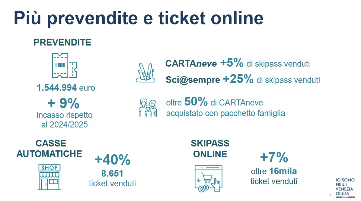 Il successo della stagione invernale 2025/2026 è dovuto a diversi fattori tra cui la politica dei prezzi che è rimasta invariata negli ultimi quattro anni, l’attenzione dedicata alle famiglie, le prevendite, la possibilità di acquistare on line lo skipass evitando code nelle biglietterie, la visibilità tramite social, le attività, lo sci notturno che ha registrato + 25% di presenze con 1800 sciatori e oltre 20 eventi che si sono svolti dal 20 dicembre al 22 marzo tra cui la Coppa del Mondo di sci alpino femminile a Tarvisio.