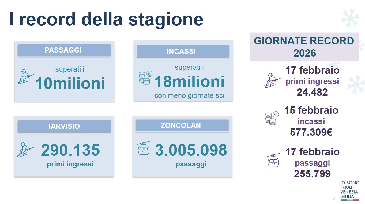 Un’altra stagione invernale da record quella del Friuli Venezia Giulia che per la prima volta ha superato 10 milioni di passaggi. Ecco un quadro generale dell'inverno 2025/2026.