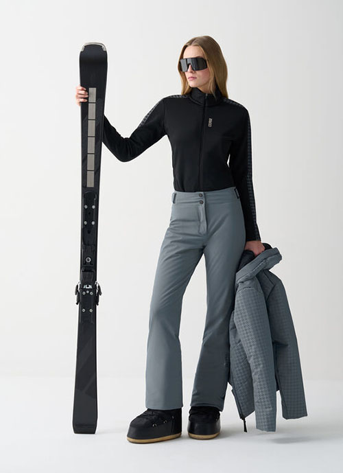 L’eleganza e lo stile tornano anche nel completo grigio storm con trama in pied de poule, con la giacca da sci (499€) realizzata con un mix tra il tessuto stretch 4Way in fibre di nylon riciclate, il soft padding dell’imbottitura Comfortemp® da 200 gr e l’ovatta Repreve® da 140 gr nelle sezioni lisce che garantiscono massima protezione nelle giornate più fredde. Il pantalone (grigio storm, 299€) è pensato per fornire la massima libertà di movimento sulle piste, con parti di imbottitura in ovatta riciclata da 80 gr e fodera in fibre di grafene.