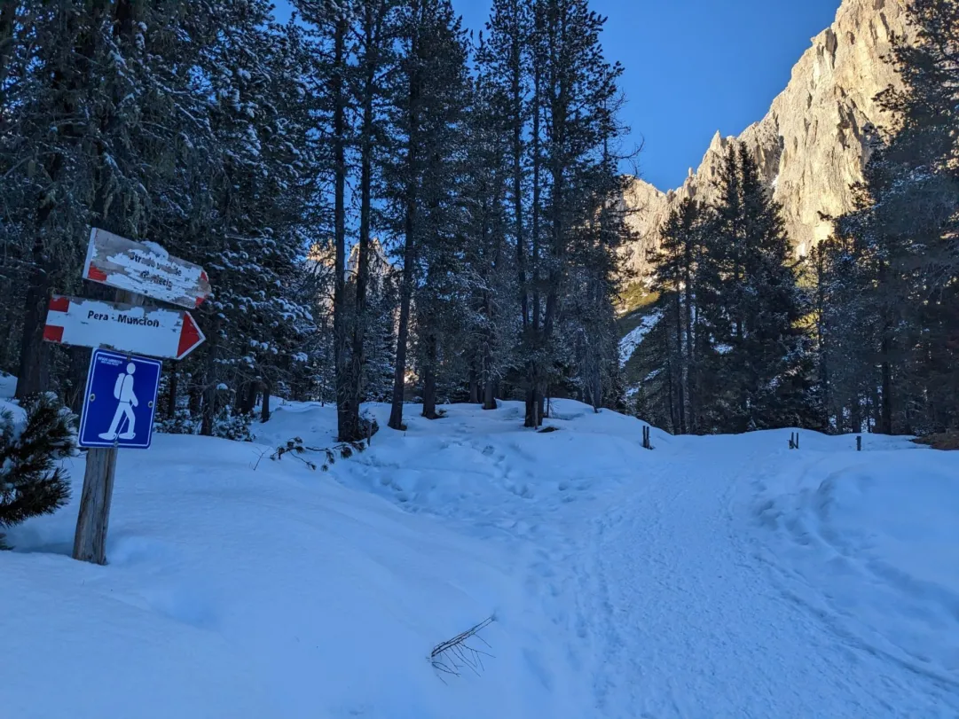 Con la funivia da Vigo si raggiunge in pochi minuti il Ciampedie, un soleggiato altopiano a 1.998 metri con una vista spettacolare sulle Dolomiti di Fassa. Dall’uscita dell'impianto, ci si dirige verso l’area giochi per bambini e si prende la seggiovia che porta comodamente a Pian Pecei. Qui, si attraversa con attenzione un breve tratto di pista, si prosegue verso destra e si aggira la stazione della seggiovia Vajolet II usando il sottopasso. Da questo punto inizia la salita: imboccare sulla destra il Sentiero delle Leggende. Inizialmente, la strada forestale costeggia il tracciato da sci, poi si allarga e sale gradualmente nel bosco. Poco prima della Malga Couler, aperta anche in inverno, si svolta a sinistra e si continua lungo il percorso ben battuto. In circa 10 minuti si arriva a Gardeccia.