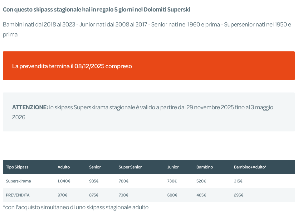 Skipass Superskirama Dolomiti Adamello-Brenta 2025/2026