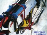 "La bici ideale invece è una bici leggera come quella da corsa. Nelle staffe posteriori si fissano gli sci al canotto della sella e davanti sul canotto verticale della bici piu omeno a 10 cm dal manubrio. L'attrezzatura per sciare, tuta, scarponi viene riposta in una sacca tipo da velista, capiente e non rigida e riposta sopra un asse di compensato che poggia a sua volta sugli sci dietro la sella. L'equipaggiamento non è complesso e con pochi soldi si può partire e praticare il vostro sport preferito."