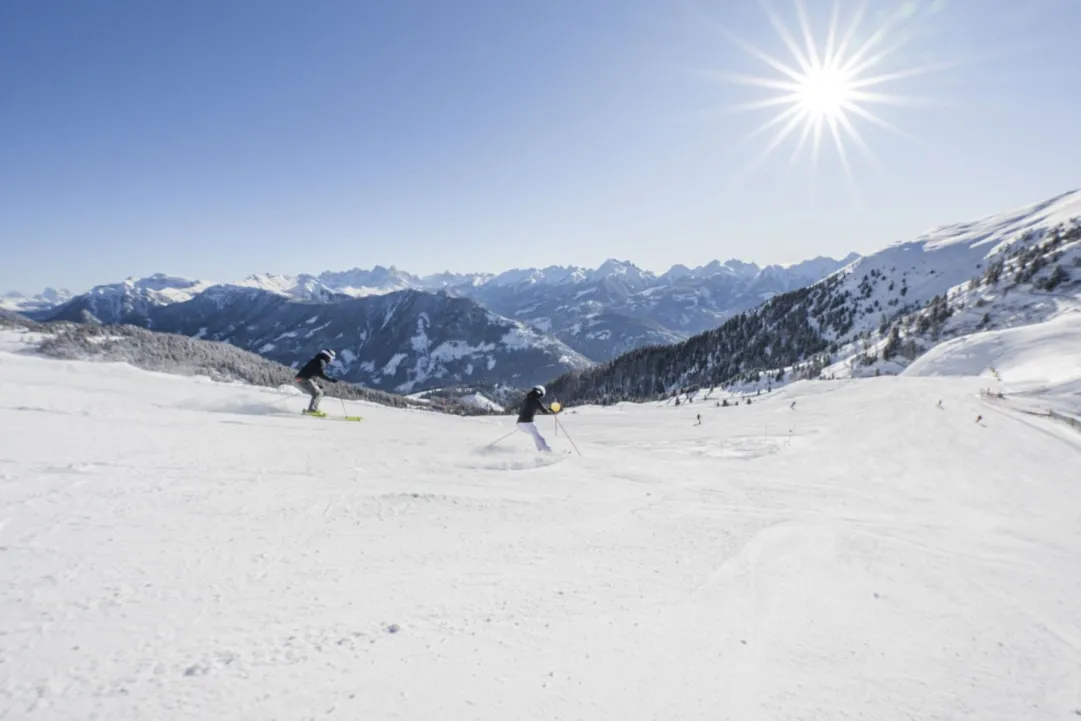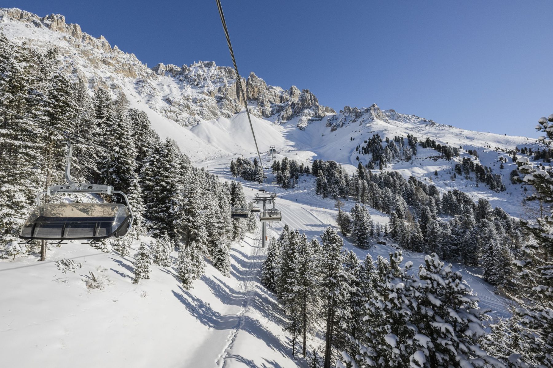 La discesa inizia dal soleggiato altopiano a 2.400 m con due varianti: la pista facile con vista panoramica e la nera “Il Muro di Santa” con 58% di pendenza e adrenalina pura.