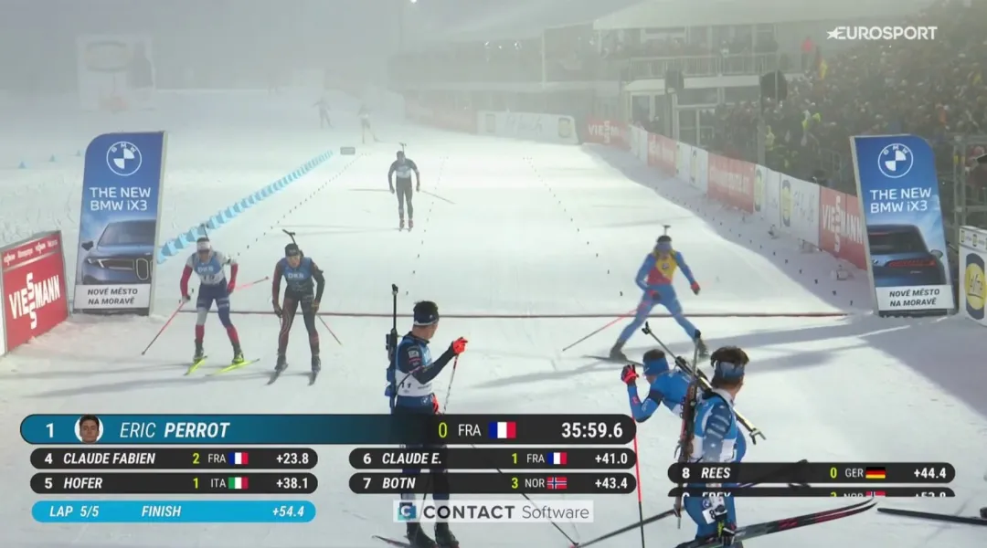 Biathlon: Perrot prende la Mass Start e strappa il pettorale giallo a Giacomel 11^, Hofer ottimo 5^