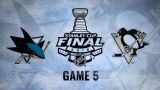 Gli Sharks sono vivi, come ha dichiarato a fine partita il capitano Joe Pavelski, e lo dimostrano in gara 5 dove per la prima volta nella serie si trovano presto nella partita a guidare nel punteggio. Brent Burns segna dopo 64 secondi, Logan Couture raddoppia un minuto e 49 secondi dopo. E' un primo periodo pirotecnico con quattro goal in 5 minuti perchè i Penguins non ci stanno e con Malkin e Hagelin pareggiano i conti. Il resto lo fa un superlativo Jones che ferma tutti i successivi 40 tiri nella partita dei Penguins mossi dalla grande motivazione di mettere le mani sulla Coppa di fronte al pubblico di casa mentre sempre nel primo periodo quando il cronometro recita 14:57 Melker Karlsson porta gli Sharks sul 3-2.
