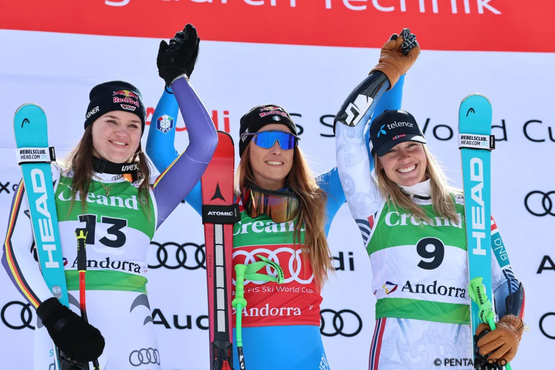 Emma Aicher e Kajsa Vickhoff Lie sono tornate sul podio, con la tedesca, 4^ e 1^ nelle due giornate precedenti, battuta di 24 centesimi dalla bergamasca e la norvegese terza per la sua seconda volta lassù in una stagione non semplice.