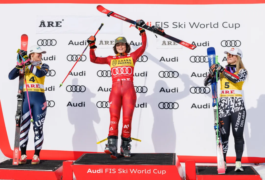 Con la cinquina stagionale tra le porte larghe, prendendosi anche Are, la 27enne stiriana ha blindato con una gara d'anticipo la sfera di cristallo, lei che ha concluso sempre nelle prime due posizioni quando è arrivata al traguardo (con due "zero" a Mont-Tremblant e Spindleruv Mlyn). Oggi l'errore fatale è quello di Rast, che esce quasi definitivamente dai giochi per la generale con Shiffrin e Aicher divise da 120 punti. Moltzan, alla sesta piazza d'onore senza aver ancora vinto in coppa: "Prima o poi arriverà".