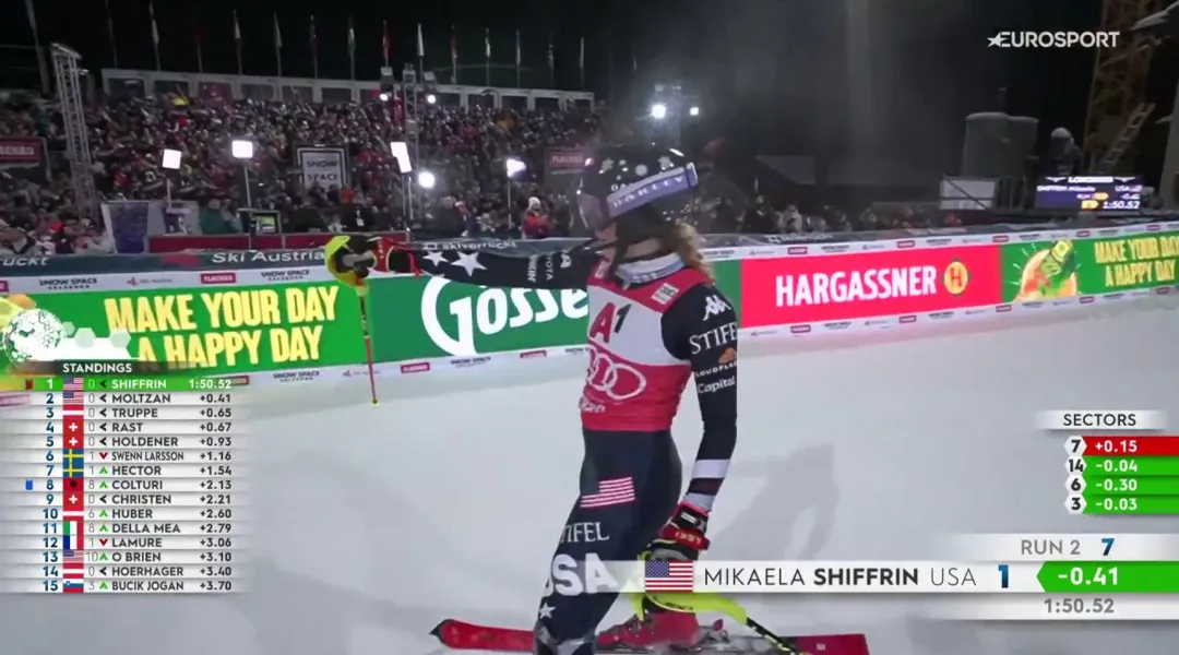 VIDEO SCI ALPINO FEMMINILE - Torna a vincere nella "sua" specialità, lo slalom, Mikaela Shiffrin. La statunitense affronta una pista abbastanza segnata e risponde agli attacchi di Moltzan e Truppe e mantiene un ritmo alto, non lasciandosi ingannare dai solchi. Nel finale festa per il podio condiviso con la connazionale Paula Moltzan.