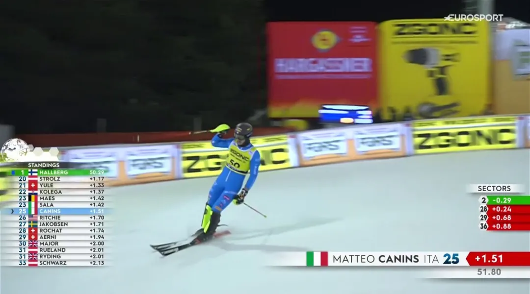 VIDEO SCI ALPINO MASCHILE - Matteo Canins centra la prima qualificazione alla seconda manche di uno slalom e lo fa in quello notturno di Madonna di Campiglio. L'azzurro è autore di una prima parte di gara velocissima, poi subentra qualche difficoltà sul muro e nella parte finale si prende qualche rischio, ma passa con il 26° tempo, immediatamente alle spalle di Tommaso Sala.