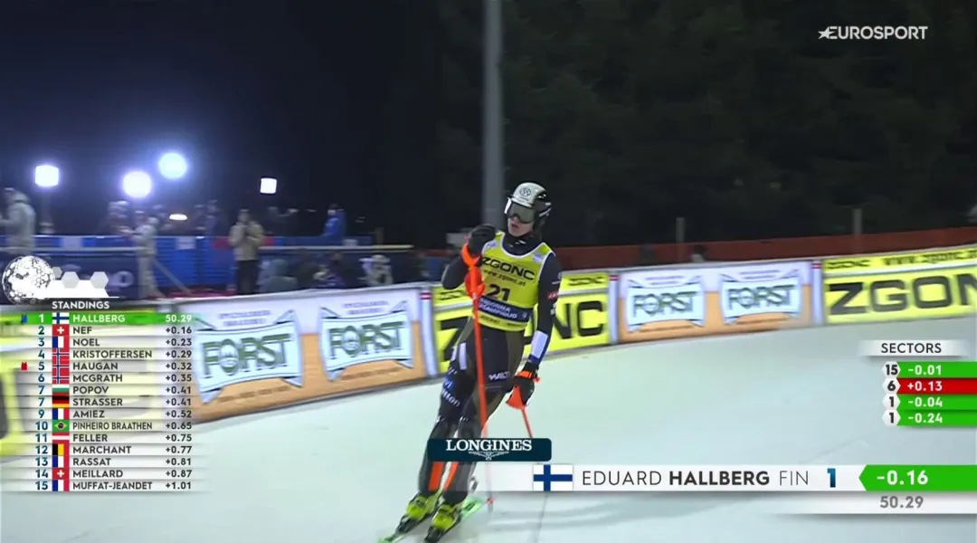 VIDEO SCI ALPINO MASCHILE - A Madonna di Campiglio il tradizionale slalom in notturna regala emozioni già dalla prima manche: con Tanuy Nef in testa, col pettorale 21 arriva Eduard Hallberg e si piazza davanti di 16 centesimi, facendo pregustare a tutti una grande seconda manche.