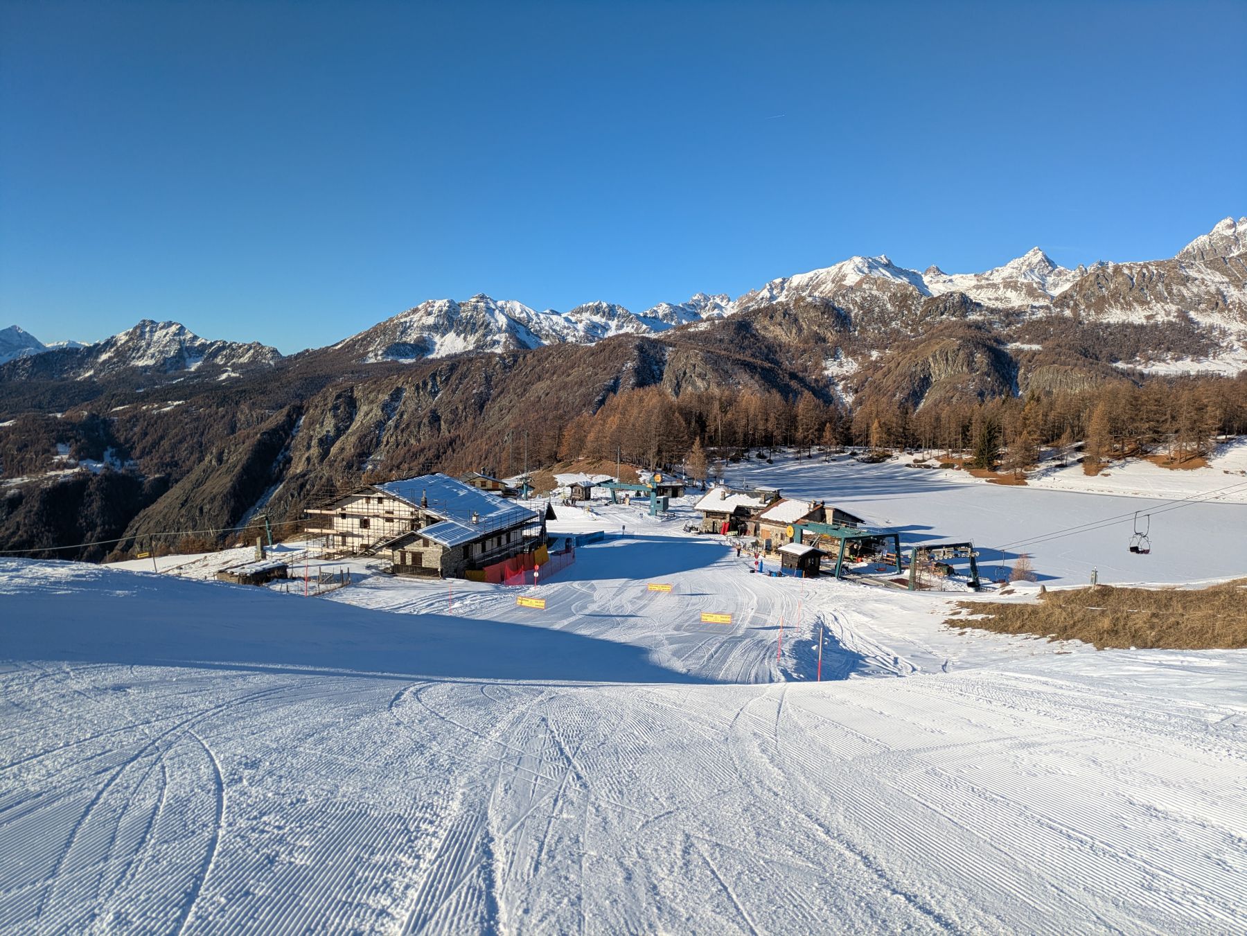 Le seggiovie servono due linee di discesa di media difficoltà. La prima con le piste Fontanafredda e Assetaz è già fruibile in questi giorni, unitamente alla pista per principianti Baby Lago. Al momento chiuse le piste Libera e Charavellesaz che completano l'offerta del comprensorio.
