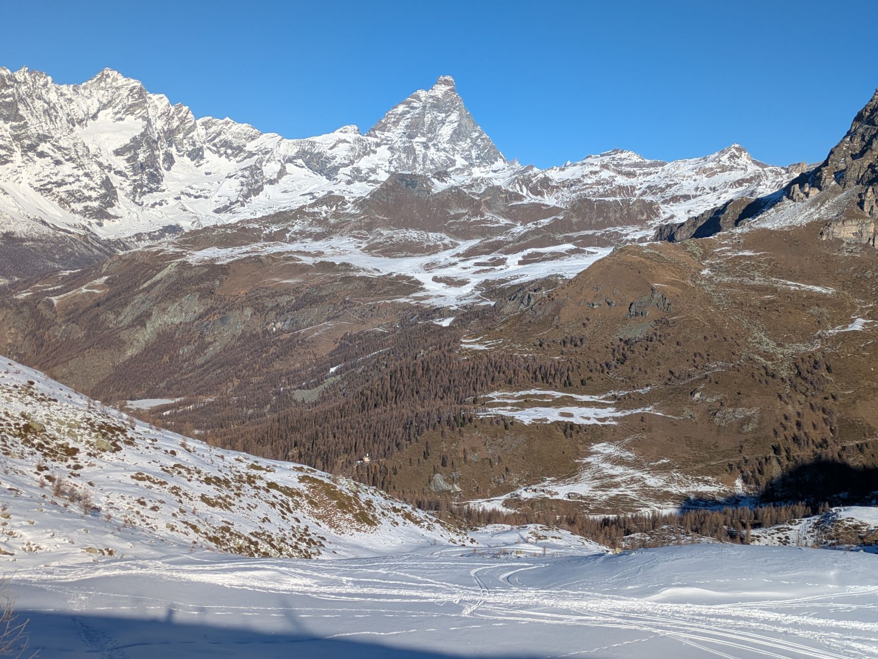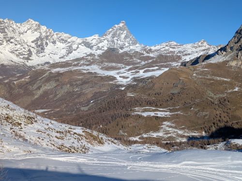 Dalla stazione di arrivo della seggiovia il panorama spazia dal Cervino alla conca di Cheneil. Evidenti anche le piste del vicino comprensorio di Cime Bianche-Valtournenche.
