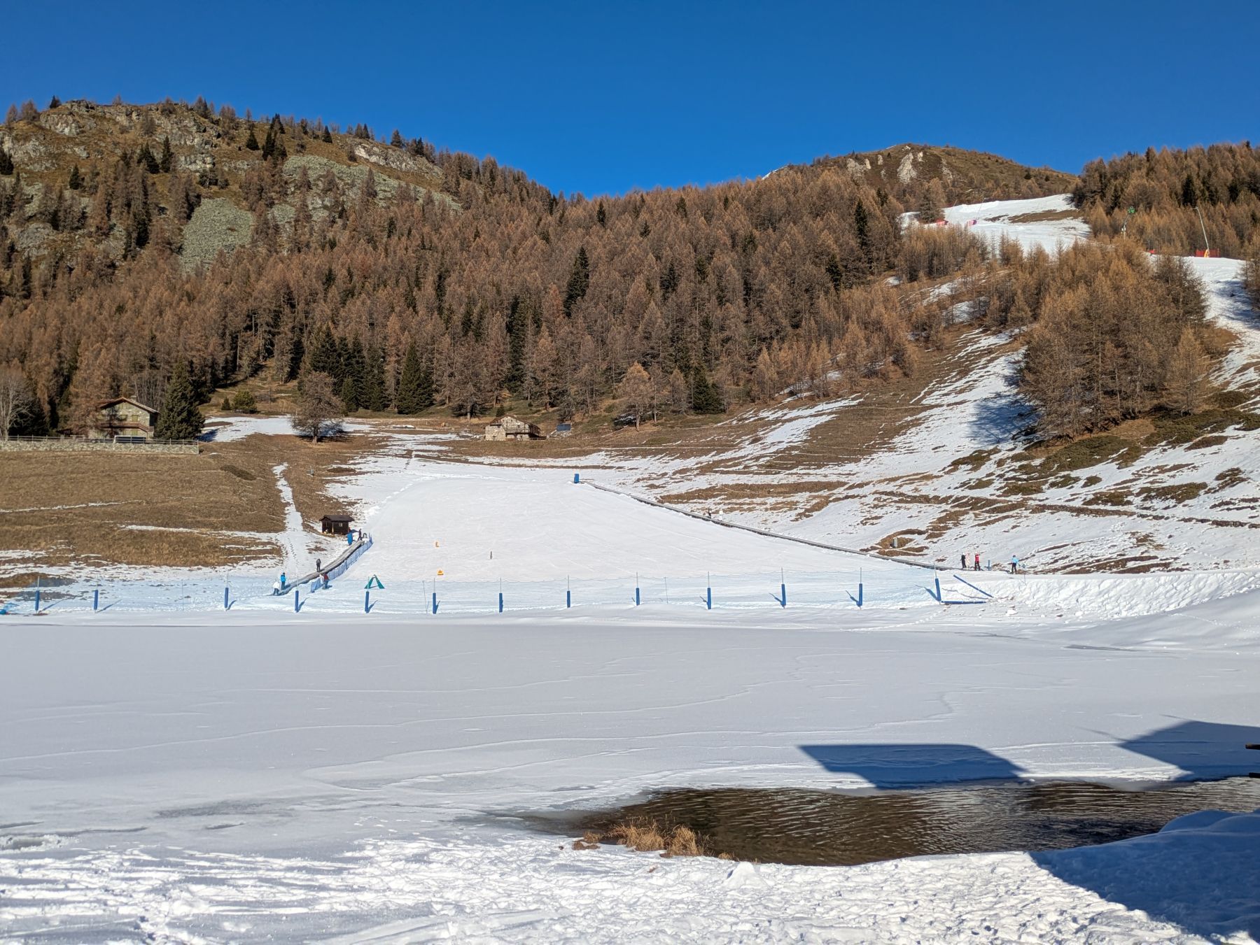 Si giunge nella soleggiata conca del Lago Lod, punto nevralgico del comprensorio con i bar ristoranti affacciati sulle rive del lago ghiacciato e la pista per sciatori principianti servita da due tapis roulant.