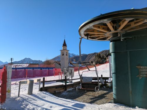 Il comprensorio di Chamois si compone di tre seggiovie biposto in successione che collegano il centro del paese con i 2.499 metri del Colle di Fontafredda, dove si spalanca una suggestiva visione panoramica sul Monte Cervino.